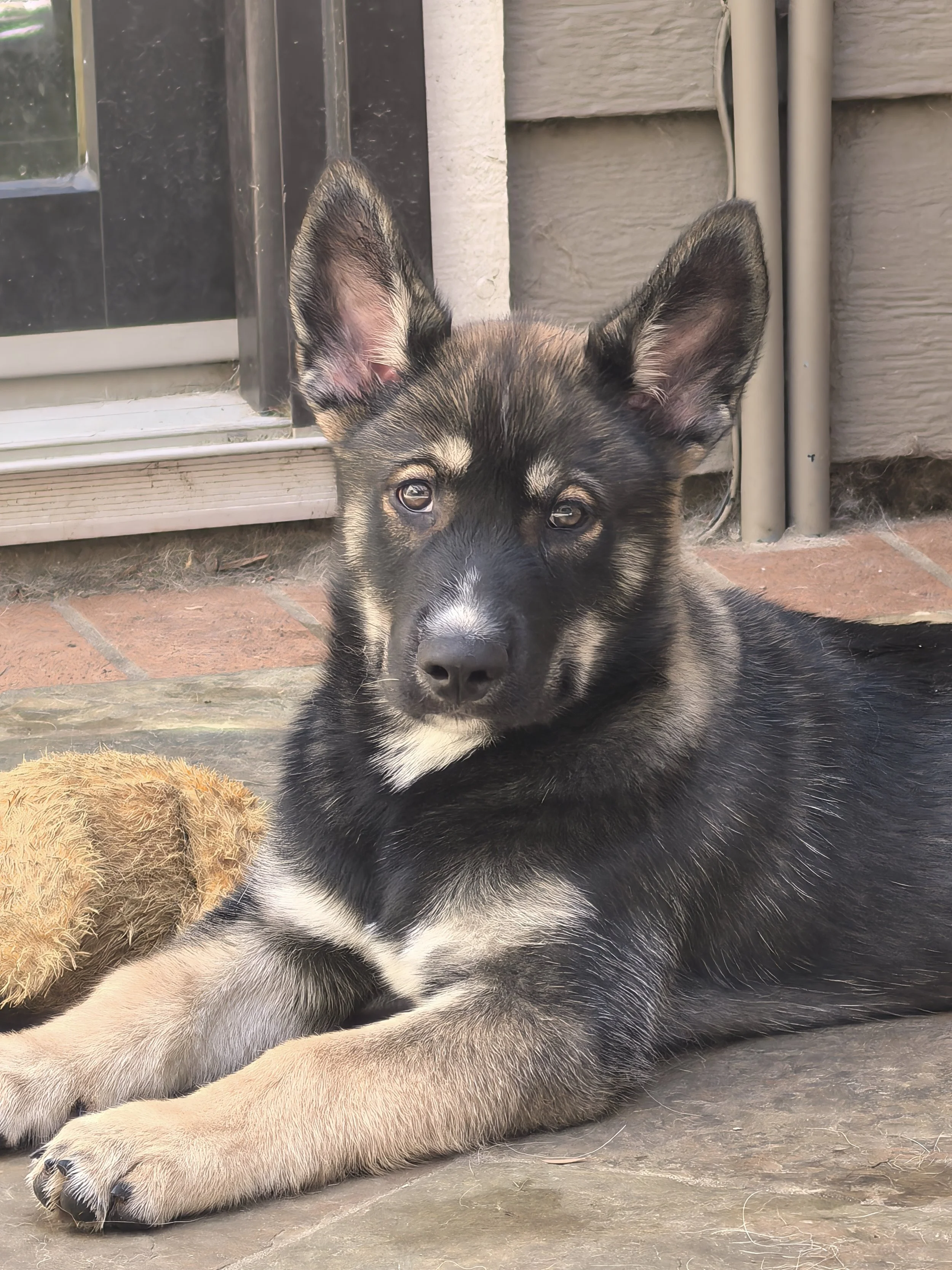 Hi, my name is Cody, I am a 3.5 month male puppy. I am just a big teddy bear and can be a bit of a baby with my two sisters. They bully me a lot, pull on my neck and legs to try to get me to play with them. I am probably the best at potty training and I have not had an accident in the home. I love to play with my toys and chase the ball when my foster daddy plays ball with me. I like playing with my sisters when they are nice to me but they play pretty rough so I tend to just be a spectator until they get tired playing together. I am crate trained and love to go for long car rides. I am pretty strong willed but do take soft direction and will be an excellent dog once I grow up. I would like to be in a home with another older dog and with older kids. I am pretty sensitive and want to please. I need someone that understands that type of German Shepherd. I look forward to meeting you soon.