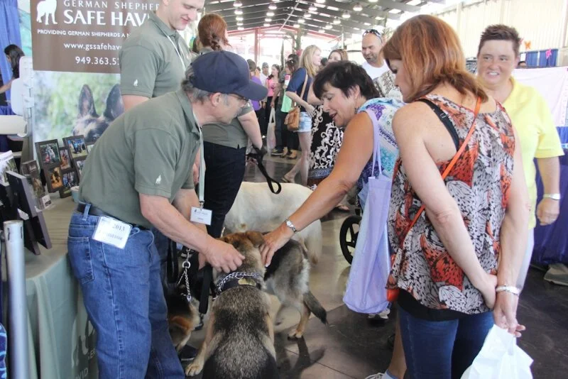 It was a bonus treat for us to have a few of our adoptive families stop by for a visit. Dakota’s mom & dad came down from Burbank, Penny’s (formerly Ulani) family drove up from Chula Vista and Toby’s (formerly Frazier) proud mom & sister came by to admire the larger than life backdrop photo of Toby that was a part of our new booth setup. Xander’s foster to adopt family made the longest trek – coming from Ft. Irwin (north of Barstow) to visit and enjoy the Pet Expo. They brought Xander with them so we could see him again. Xander’s former foster siblings were happy to see him again too, especially Chloe who wanted to do nothing but play with him!